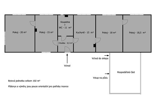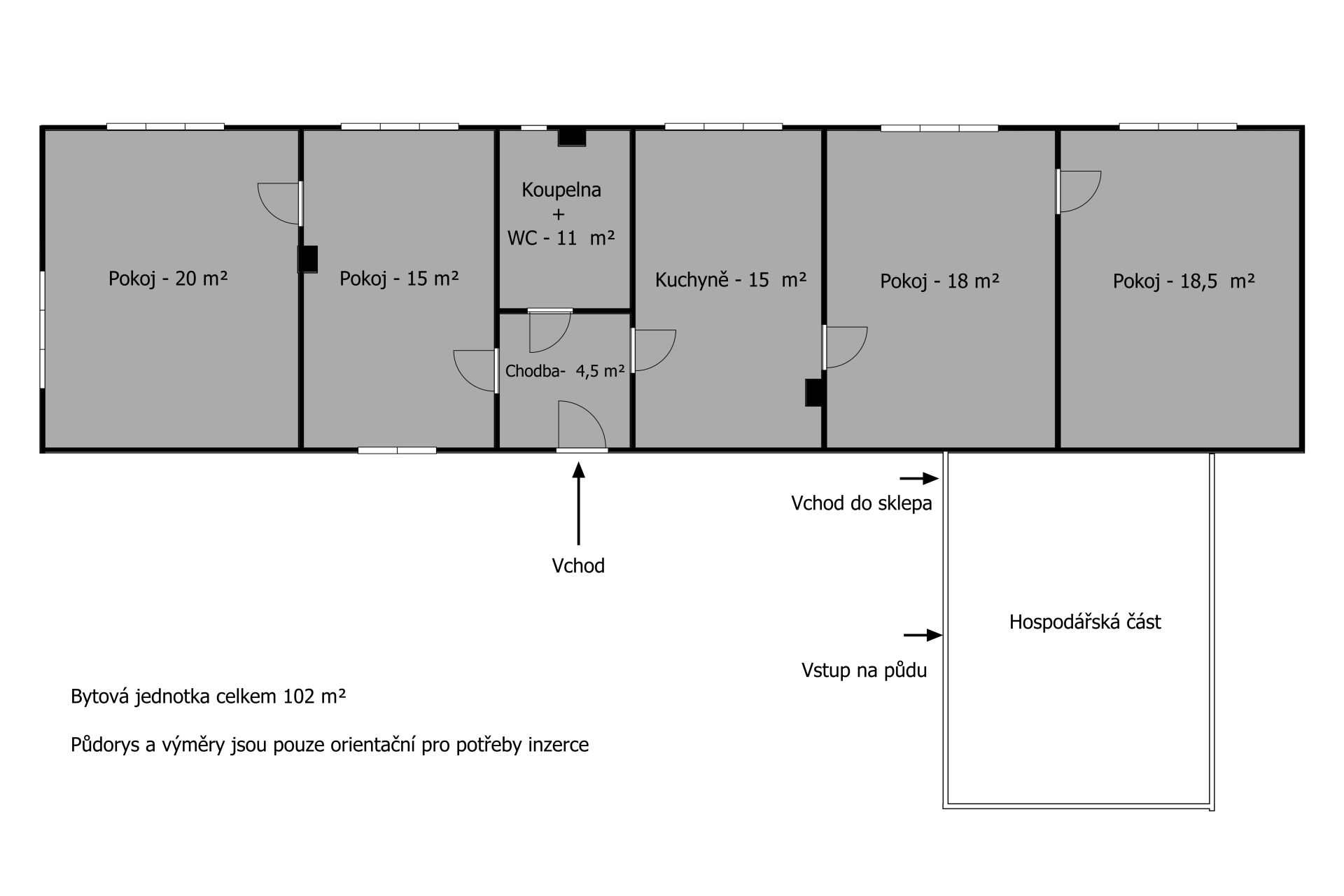 Současná dispozice umožňuje dům rozdělit na dvě menší bytové jednotky, přestavět jej na bezbariérové bydlení, nebo vytvořit prostorné rodinné bydlení.