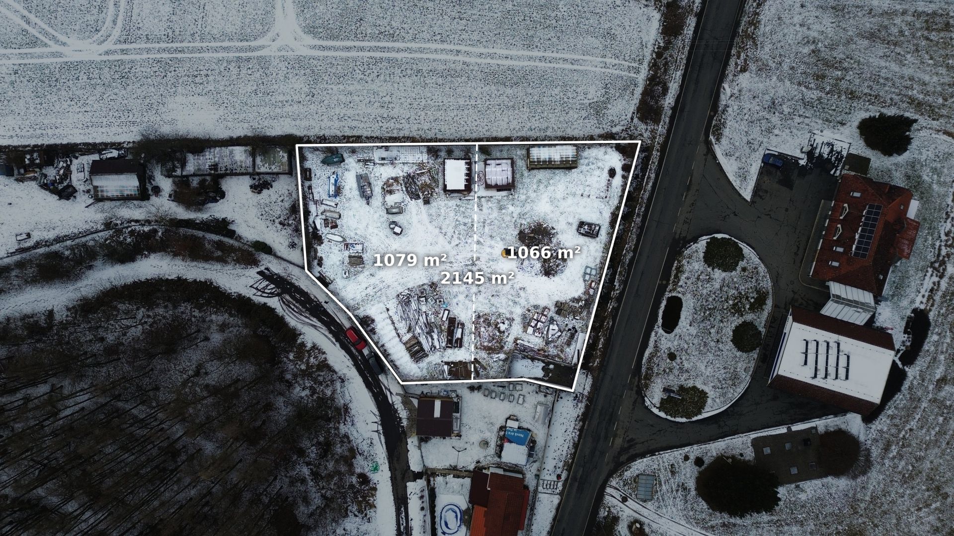 Pozemek je nově geometricky rozdělen na dvě parcely o výměře 1 066 m² a 1 079 m². Každá parcela má vlastní vjezd a zahradní domek.